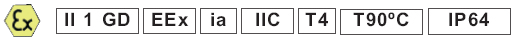 Use in gaseous atmospheres: II G EEx ia IIC T4Use in dusty atmospheres: II 2 D T90ºC IP64Use for minig applications: I M2 EEx ia I